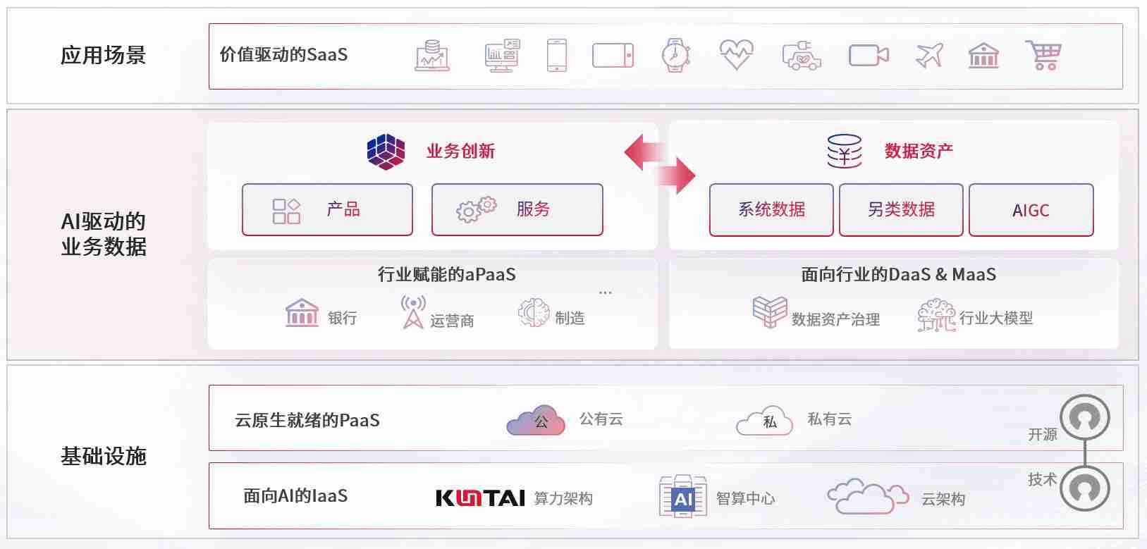 数字时代,,,,围绕企业数字化转型的关键要素,,腾博tengbo9885官网数码开创性的提出数云融合战略和技术体系框架,,着力在云原生、、、、数字原生、、AI原生和信创产业上架构产品和服务能力,,为处在不同数字化转型阶段的快消零售、、汽车、、、、金融、、、医疗、、、、政企、、教育、、、、运营商等行业客户提供泛在的敏捷IT能力和融合的数据驱动能力,,,构建跨界融合创新的数字业务场景和新业务模式,,,助力企业级客户建立面向未来的核心能力和竞争优势,,,,全面推动社会的数字化、、、、智能化转型升级。。。